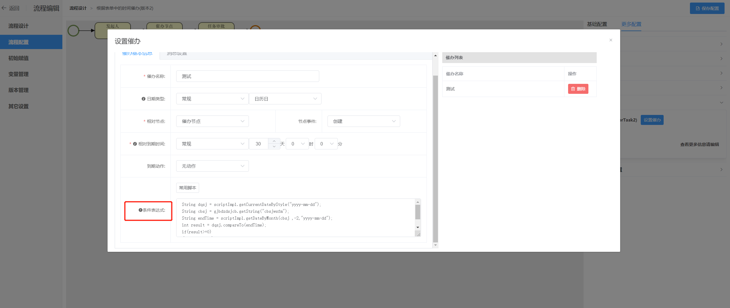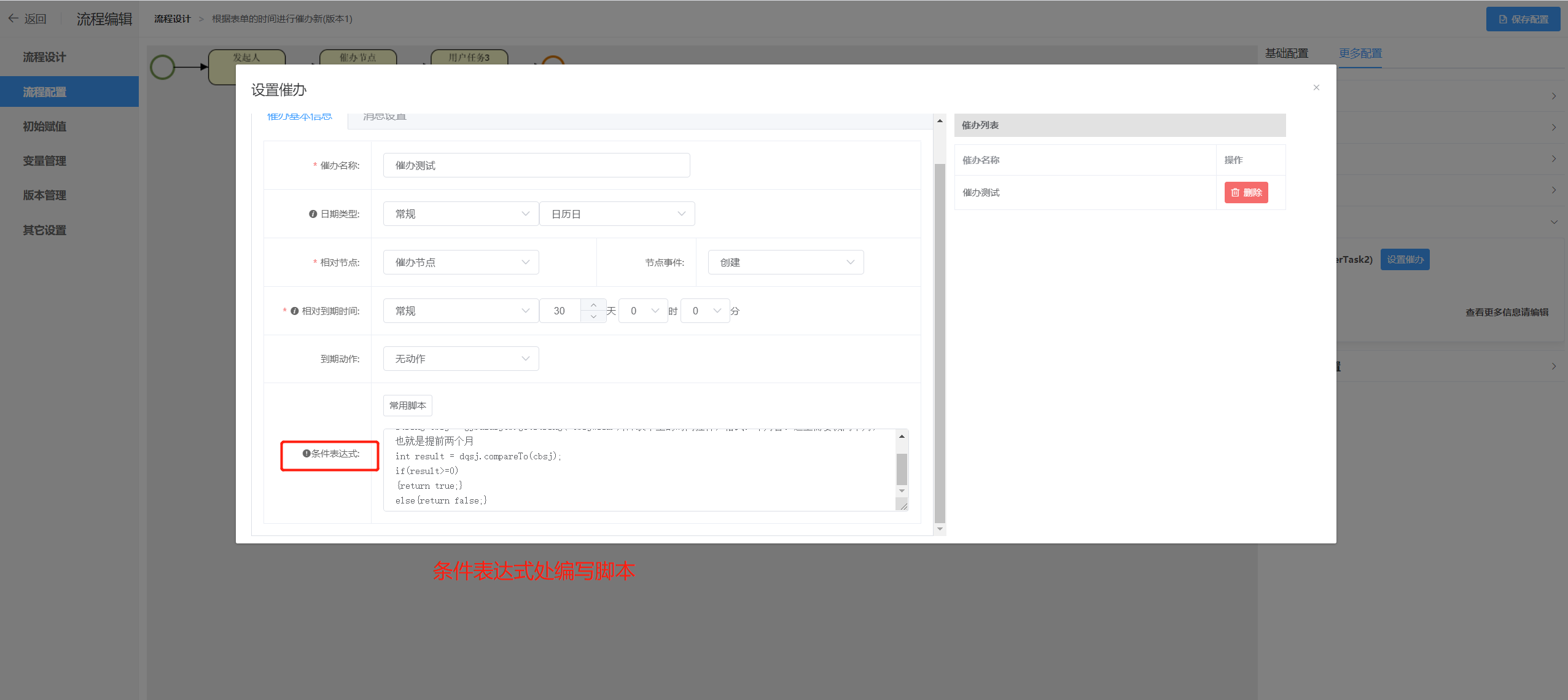 3.2.1 获取表单的时候后用其他方式先处理一次;比如用辅助字段A,表单配置引入脚本处编写js脚本使辅助字段A的值为选的时间的提前两个月,催办的脚本则设置为辅助字段A。