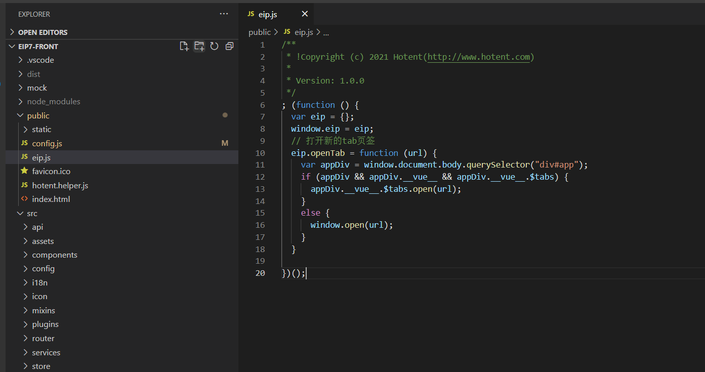 1.在front的父页面index.html中引入了eip.js工具包,该工具包以eip为名称空间,如下图所示: