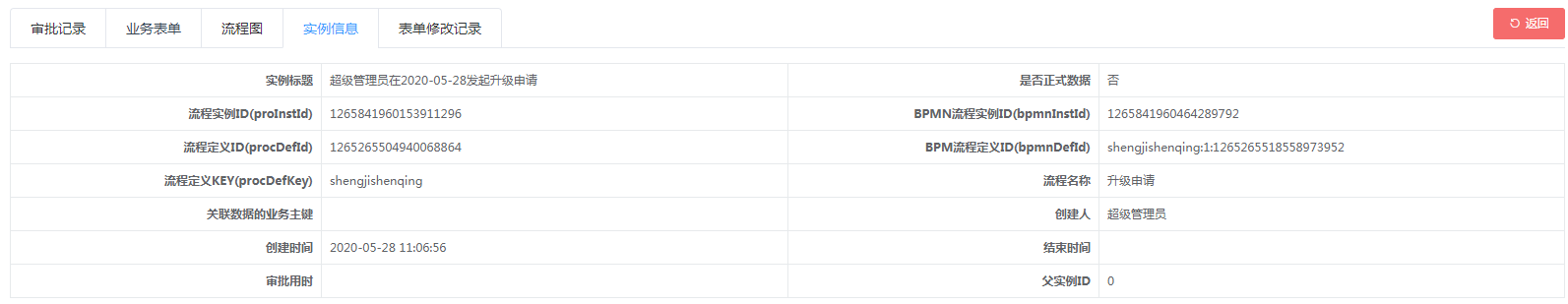 - 查看流程明细:点击流程实例列表的“查看”按钮,进入“查看实例”详情页面,在查看任务页面中有四个tab页,分别是“审批记录”,“业务表单”,“流程图”, “实例信息”,默认显示“审批记录”页面。如下所示: