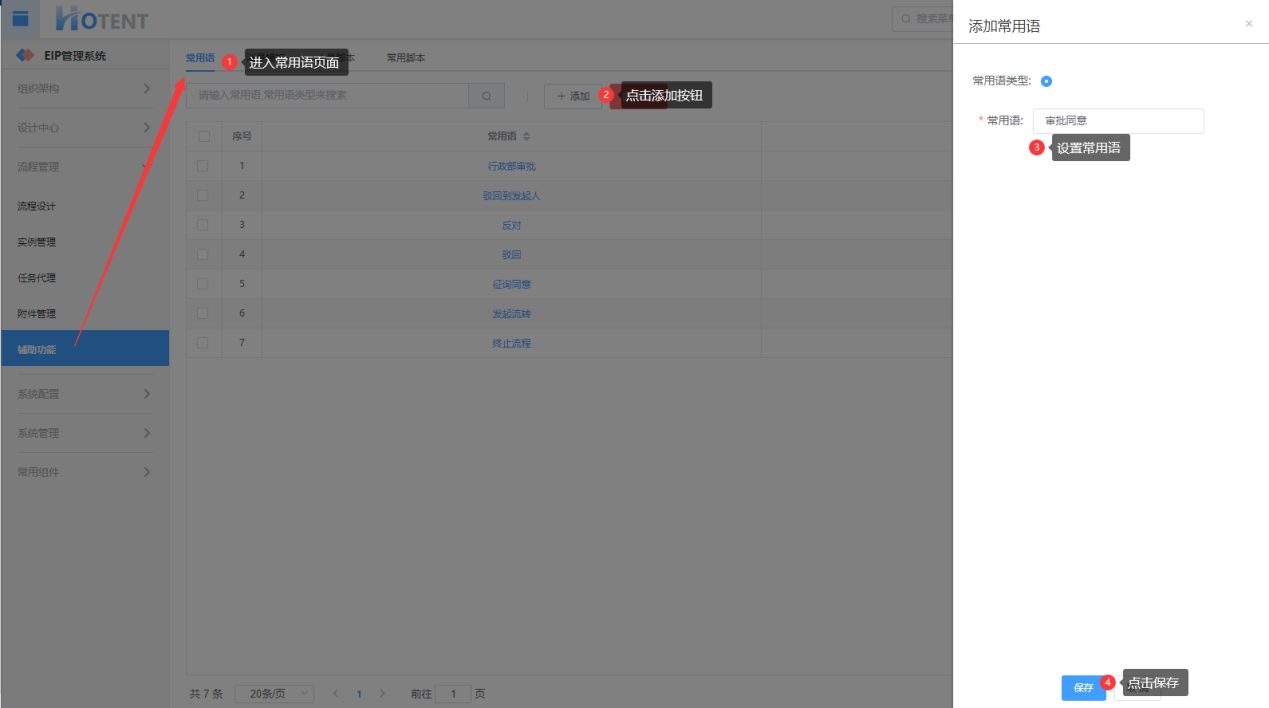 第一步:【流程管理】→【辅助功能】→【常用语】;