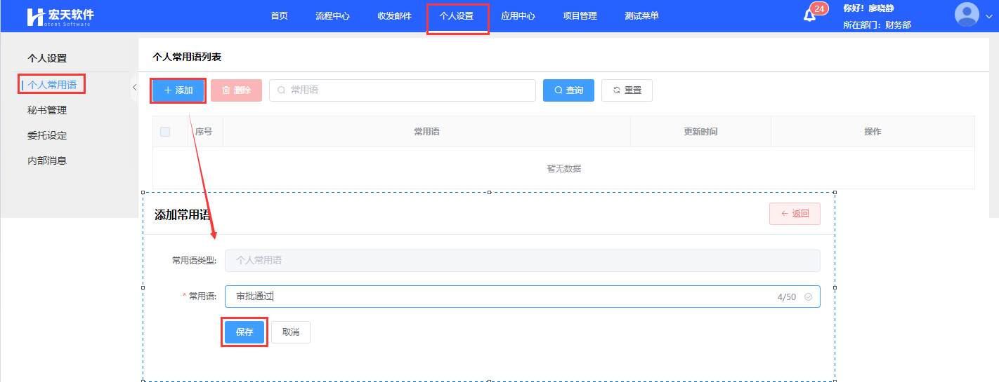 在【常用语】页面中添加流程审批时使用的审批语,这里添加的常用语系统中所有用户都可以使用。