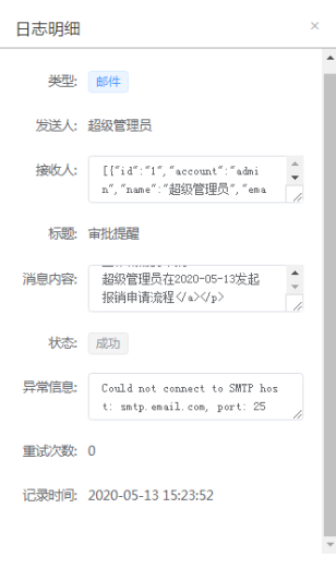 本系统支持邮件、短信、语音、微信等通知类型,在流程运转过程中,我们可以选择一种或多种通知类型进行消息发送,也可配置流程任务自动给节点处理人发送通知等。消息的发送状态、发送内容等均可在消息发送日志中查看