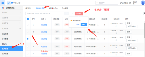 操作:【系统管理】→【系统日志】→【消息发送日志】→勾选需删除的日志→点击“删除