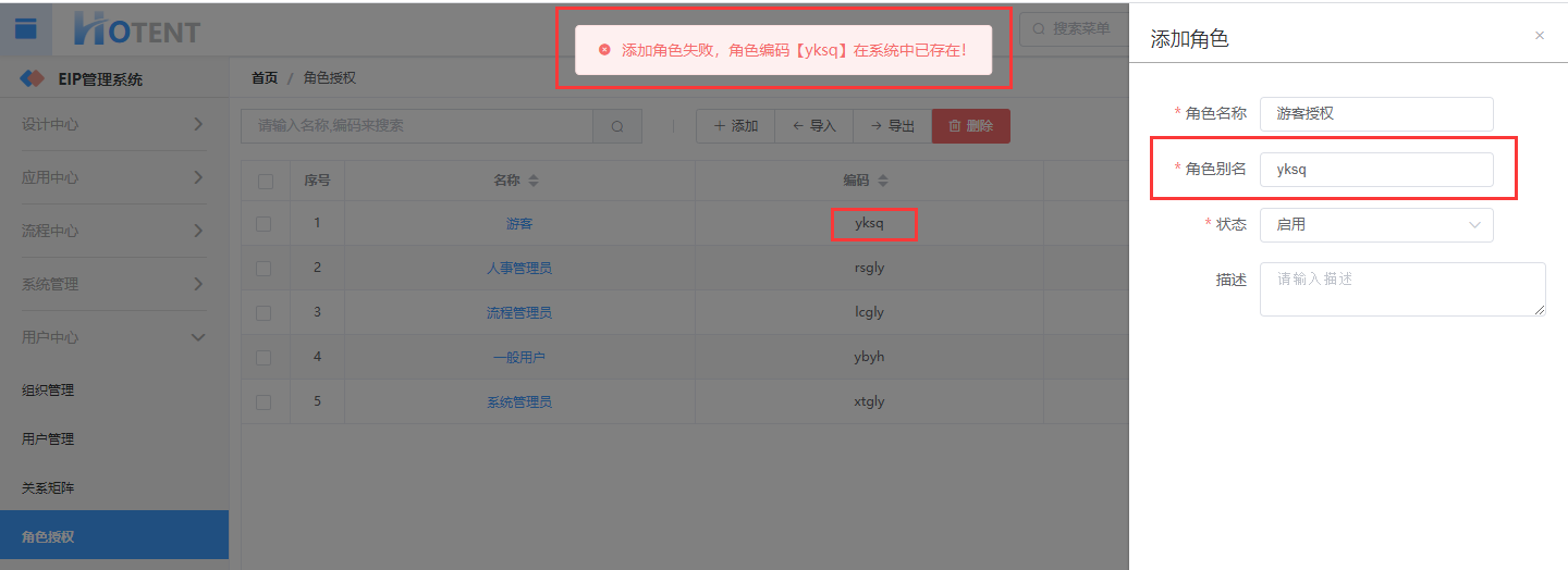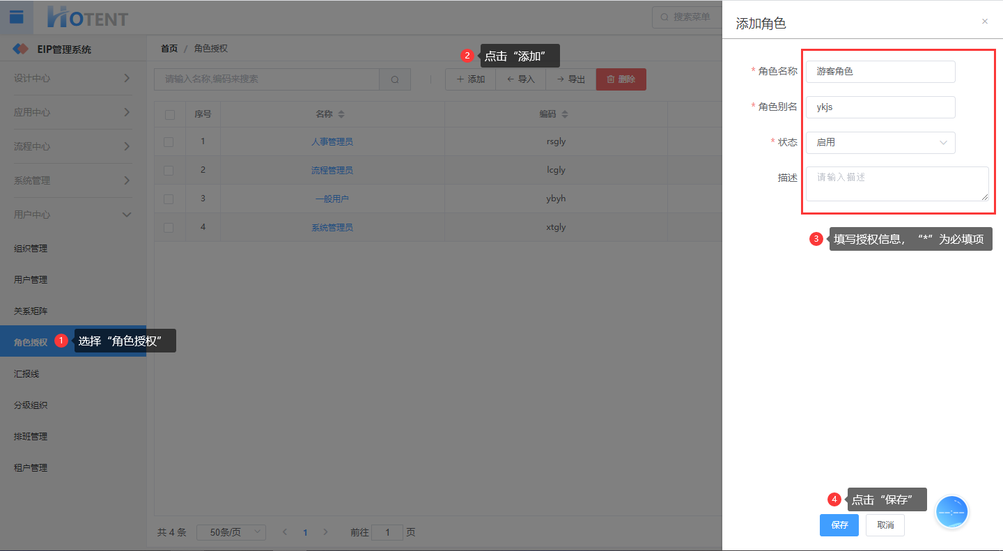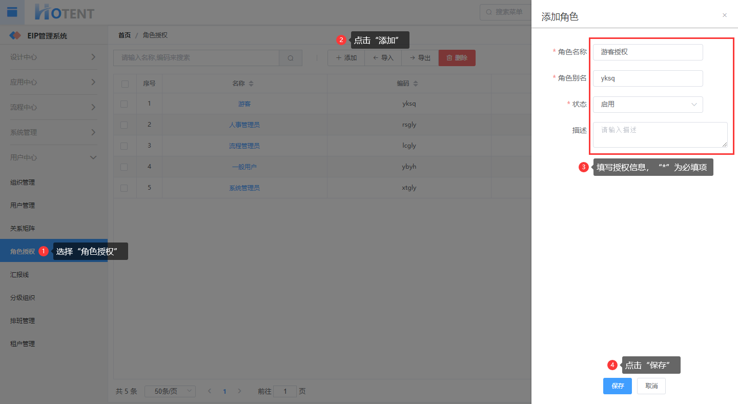 操作:【用户中心】→【角色授权】→单击“添加”→填写授权信息→单击“保存”