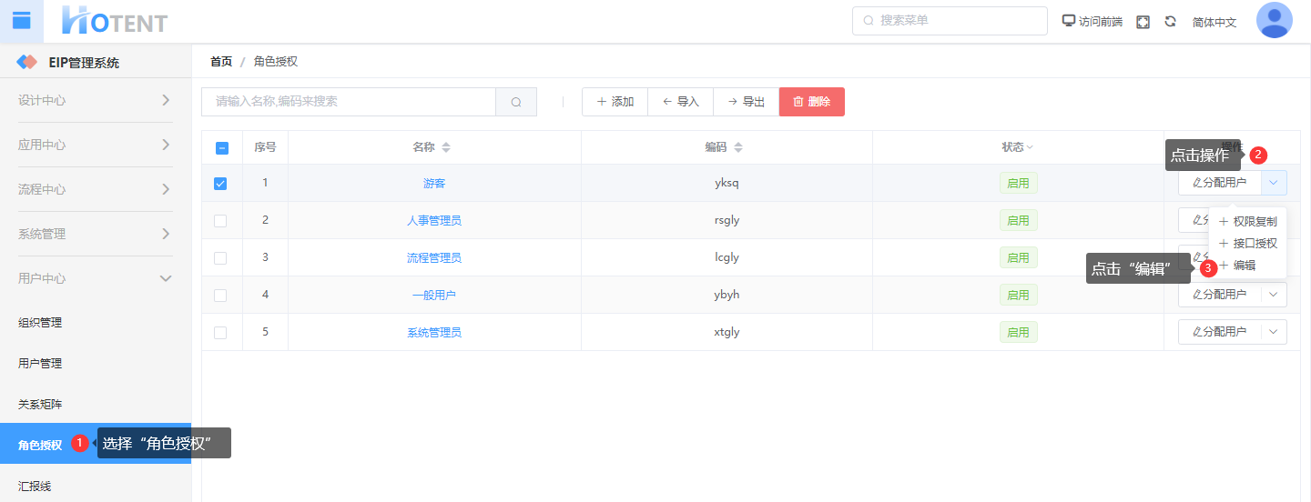 操作:【用户中心】→【角色授权】→点击操作→点击“编辑”→填写授权信息→单击“保存”