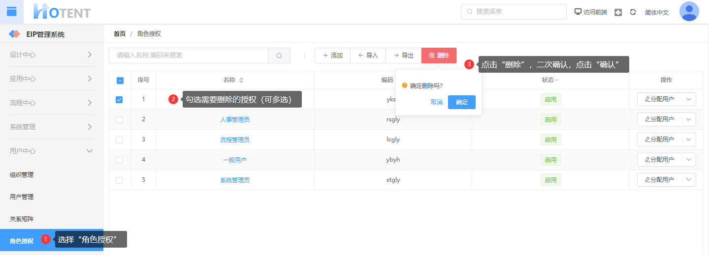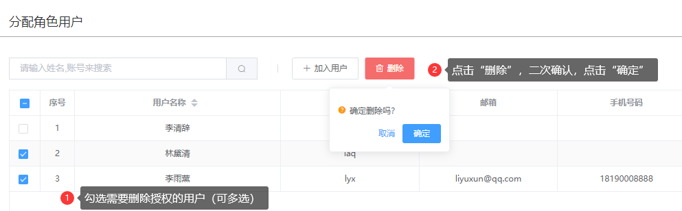 操作:【用户中心】→【角色授权】→点击操作→点击“分配用户”→点勾选需要删除授权的用户→单击“删除”,二次确认,点击“确定”