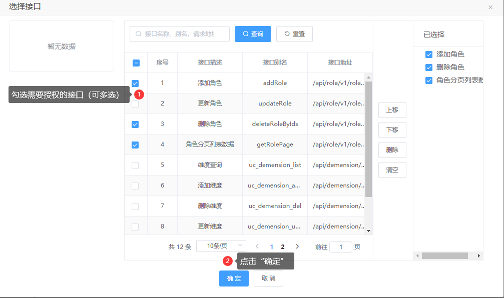 操作:【用户中心】→【角色授权】→点击操作→点击“接口授权”→点击“添加”→勾选需要授权的接口→单击“确定”