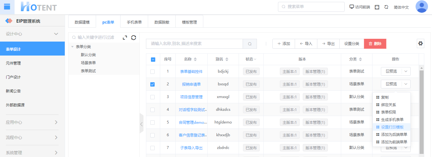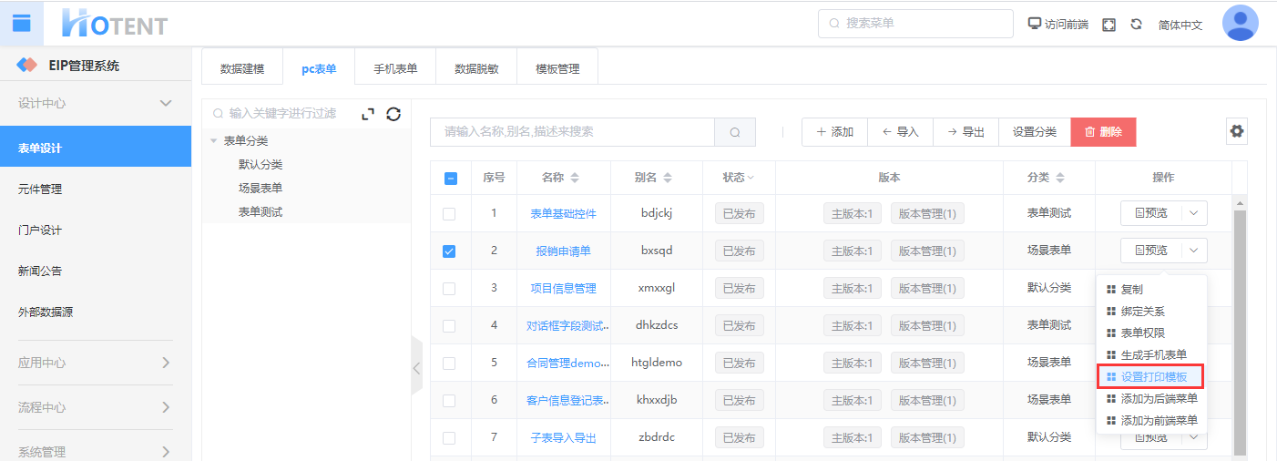 ① 进入【pc表单】,找到“报销申请单”表单,点击操作列下的“设置打印模板”;