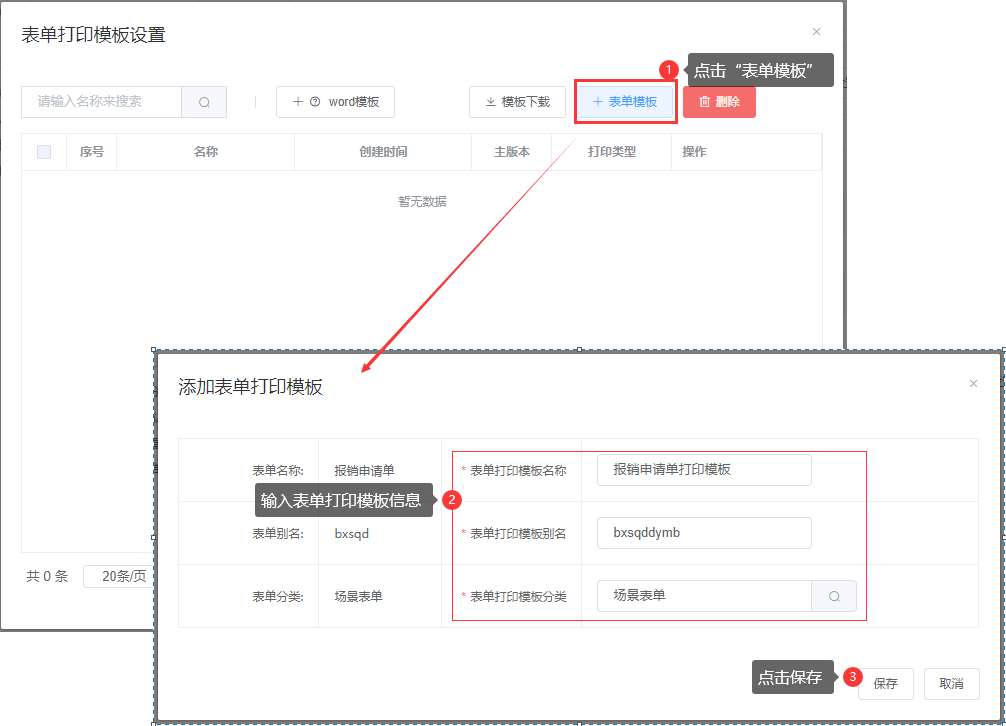 ② 点击“表单模板”,输入表单打印模板名称、表单打印模板别名等信息,点击保存;