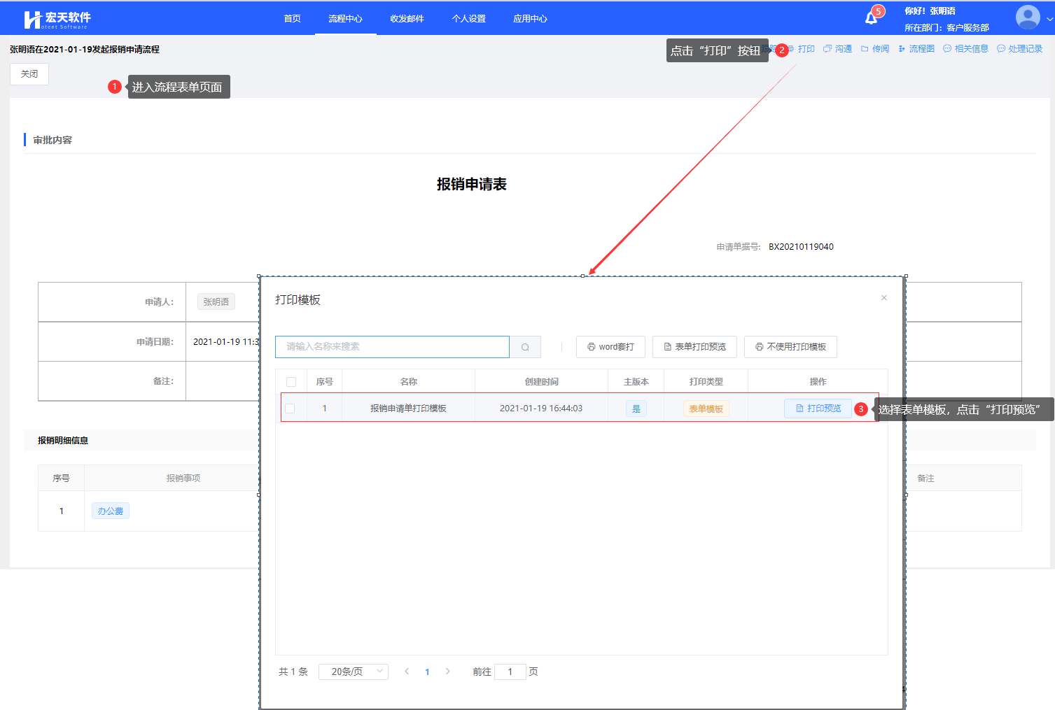 第二步:在打印时选择模板“报销申请单打印模板”打印
