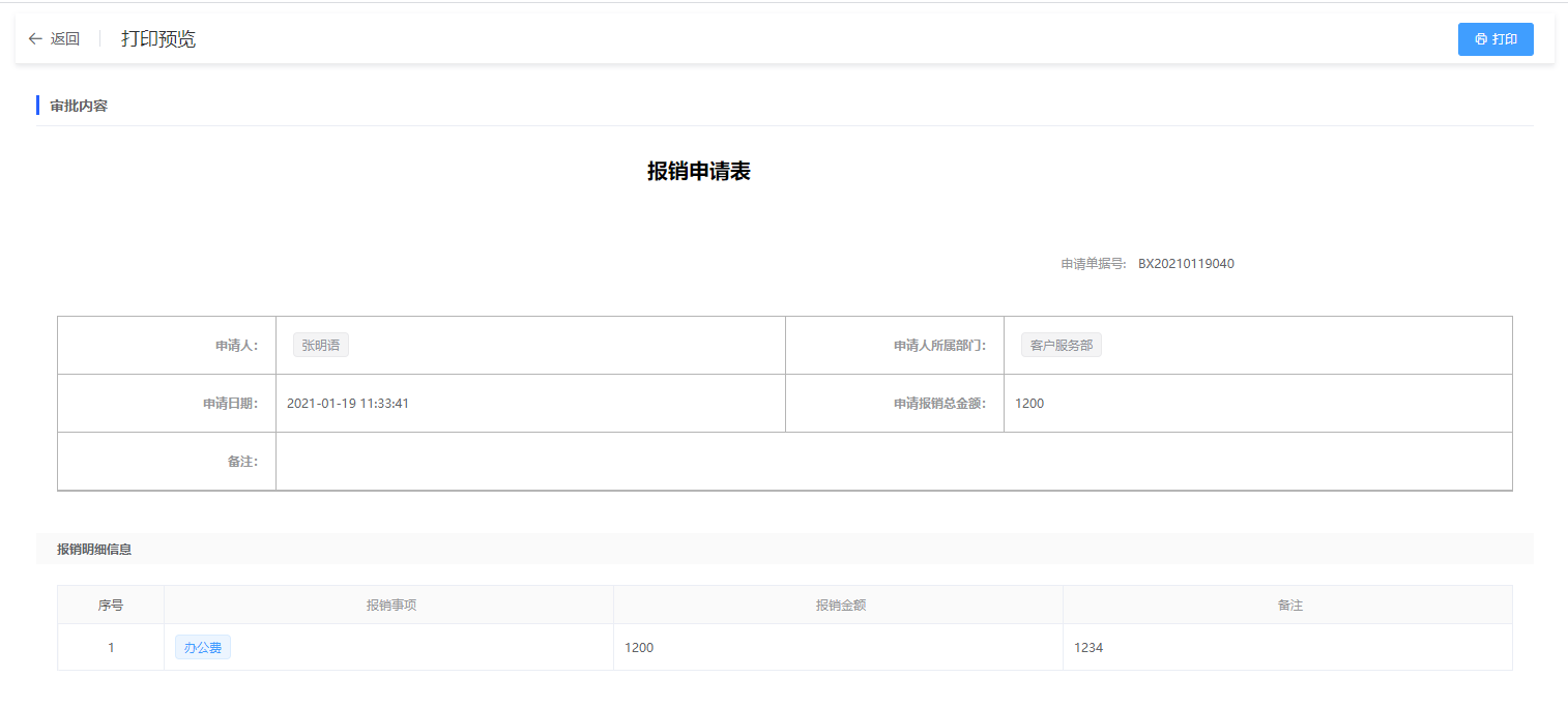 打印已审批结束的报销申请表;