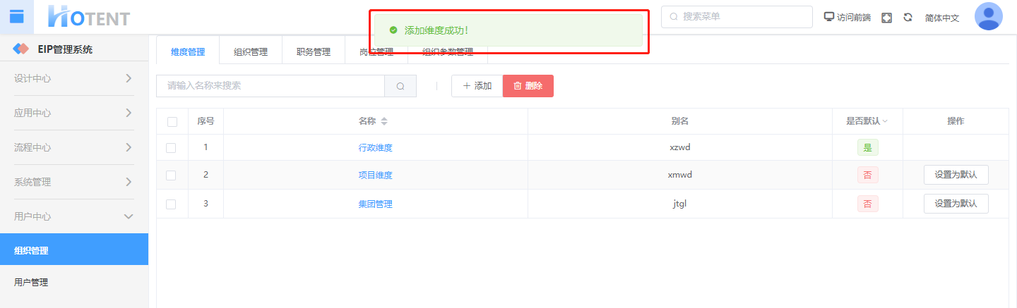 第一步:【用户中心】→【组织管理】→【维度管理】,点击添加