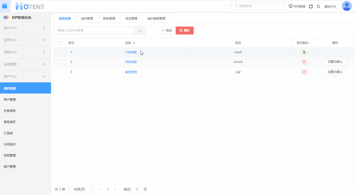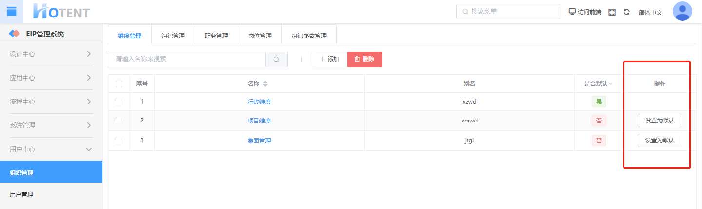 在"操作"直接设置即可。设置默认维度后,在用户中心】→【组织管理】→【组织管理】中默认显示该维度。