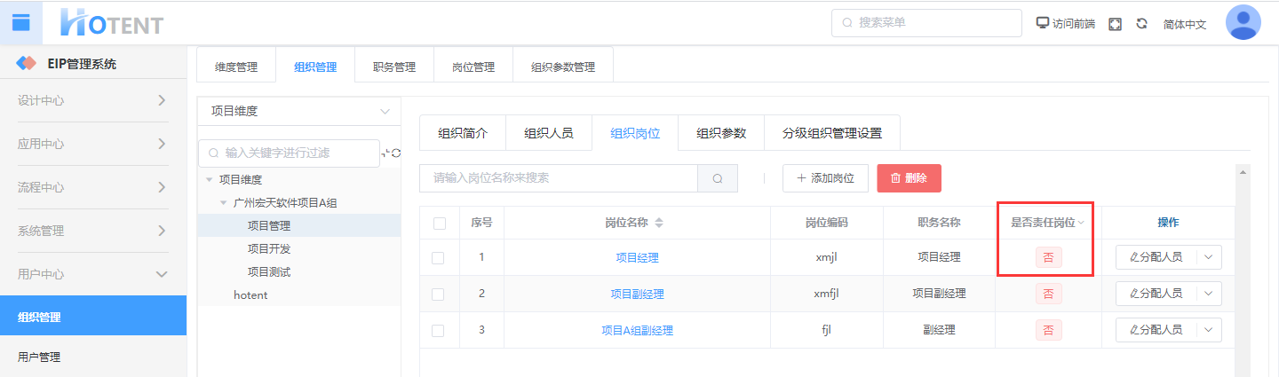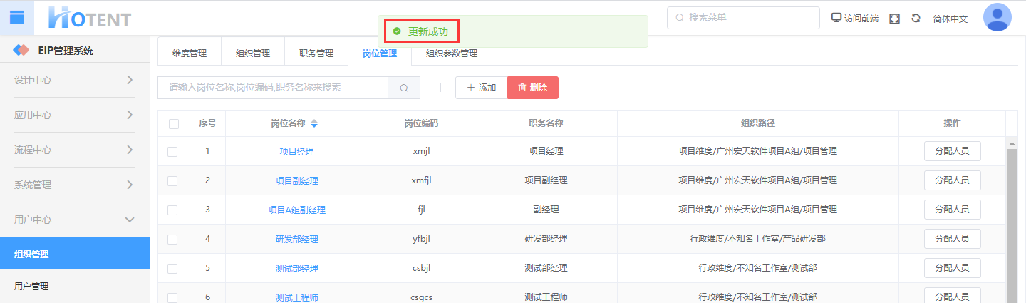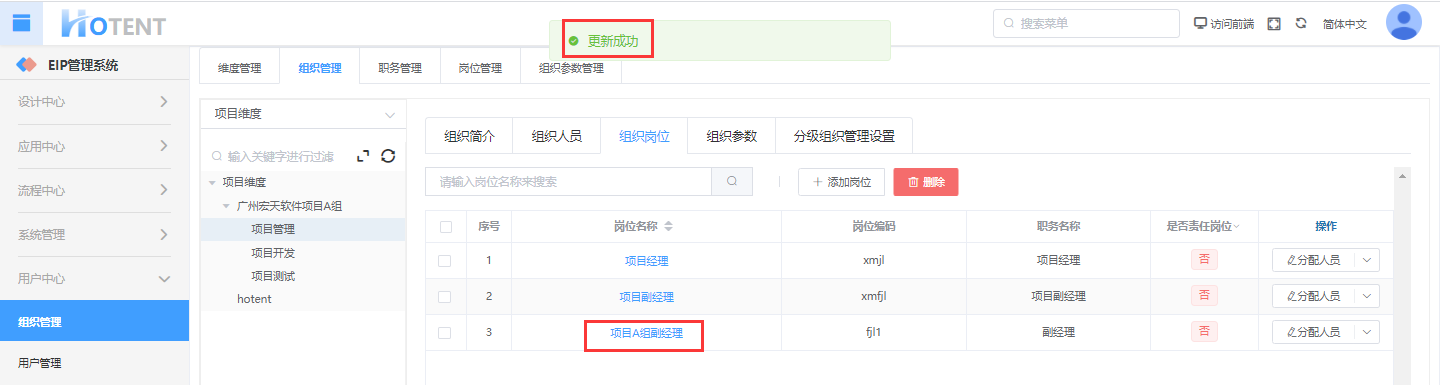设置组织下岗位,也可给组织岗位分配人员,组织岗位中分配的人员也为该组织下人员。一个组织岗位下可分配多个用户,一个用户也可作为多个组织岗位人员。