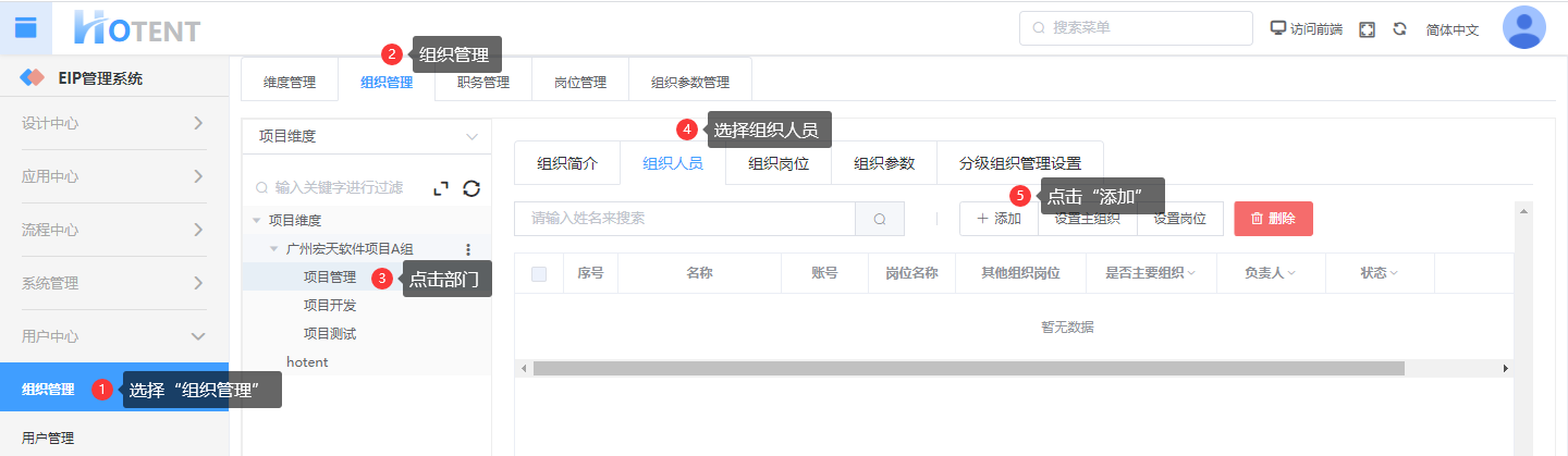 一级操作:【用户中心】→【组织管理】→【组织管理】→点击组织名称→点击“组织人员”→点击“添加”