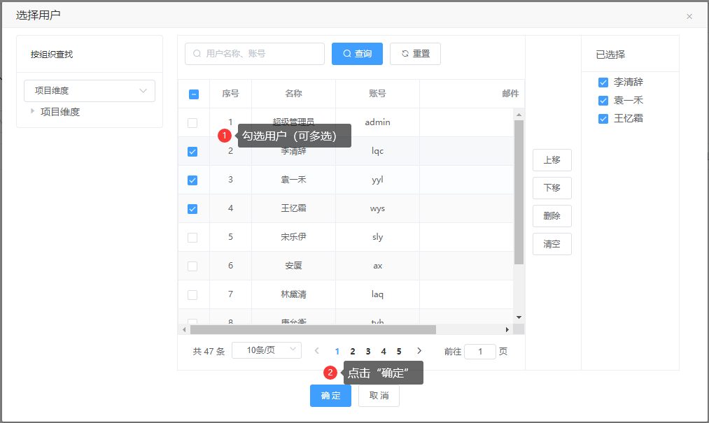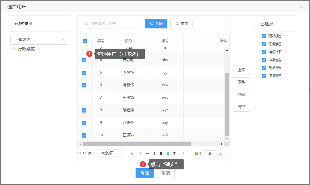 二级操作:勾选用户(可多选)后点击”确定“即可