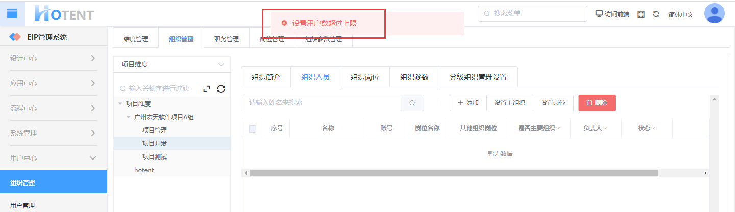 注:如组织设置不允许超过限编,添加人员总数量不可超过组织限编用户数量,提示如图: