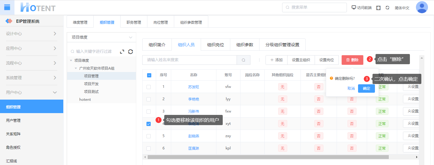 操作:【用户中心】→【组织管理】→【组织管理】→点击组织名称→点击“组织岗位”→点击“分配人员“→勾选需删除的人员(可多选)→点击“删除”