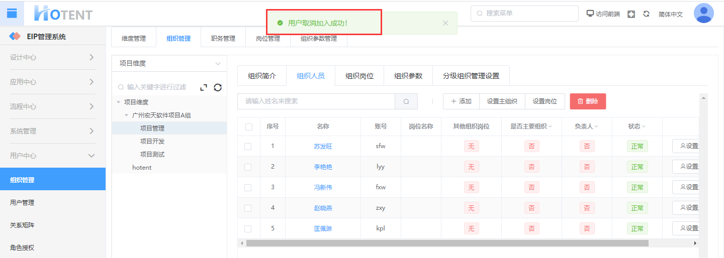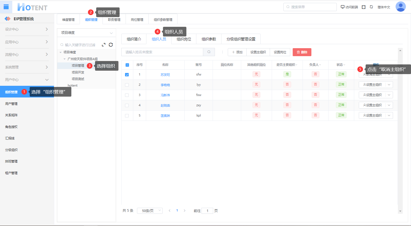 操作:【用户中心】→【组织管理】→【组织管理】→点击组织名称→点击“组织人员”→点击“取消主组织“