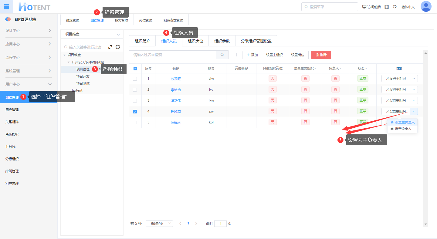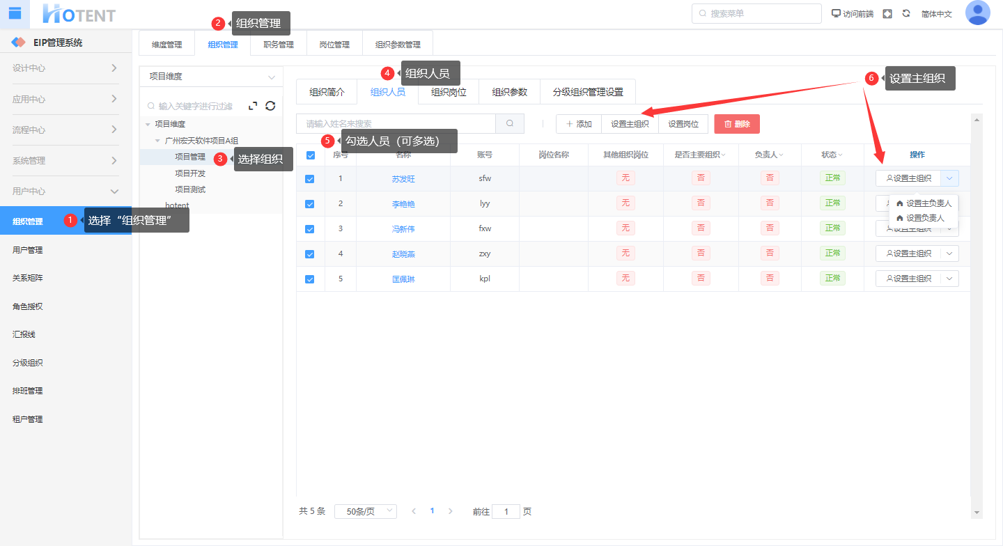 操作:【用户中心】→【组织管理】→【组织管理】→点击组织名称→点击“组织人员”→点击“设置主负责人/设置负责人“