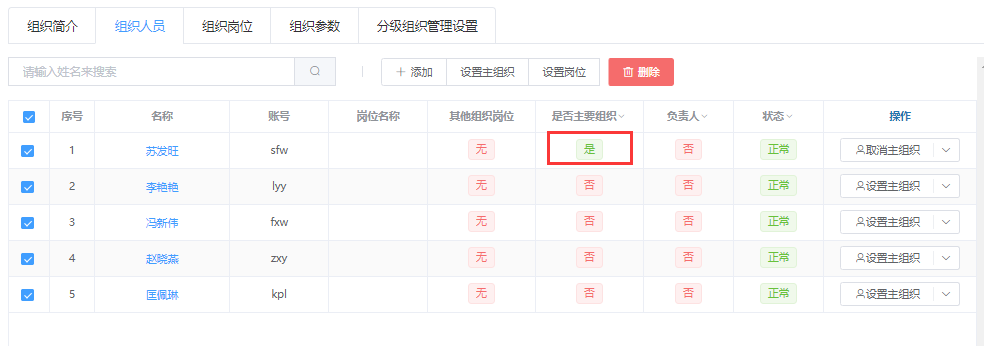 操作:【用户中心】→【组织管理】→【组织管理】→点击组织名称→点击“组织人员”→点击“设置主组织“