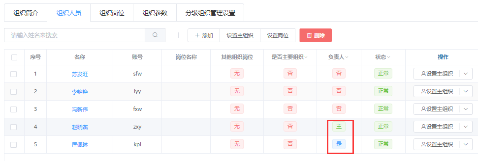 注:每个组织下仅能设置一个“主负责人”,可设置多个“负责人”,如该组织下已存在“主负责人”,当设置另一用户为“主负责人”时,原先设置的“主负责人”将变为“负责人”