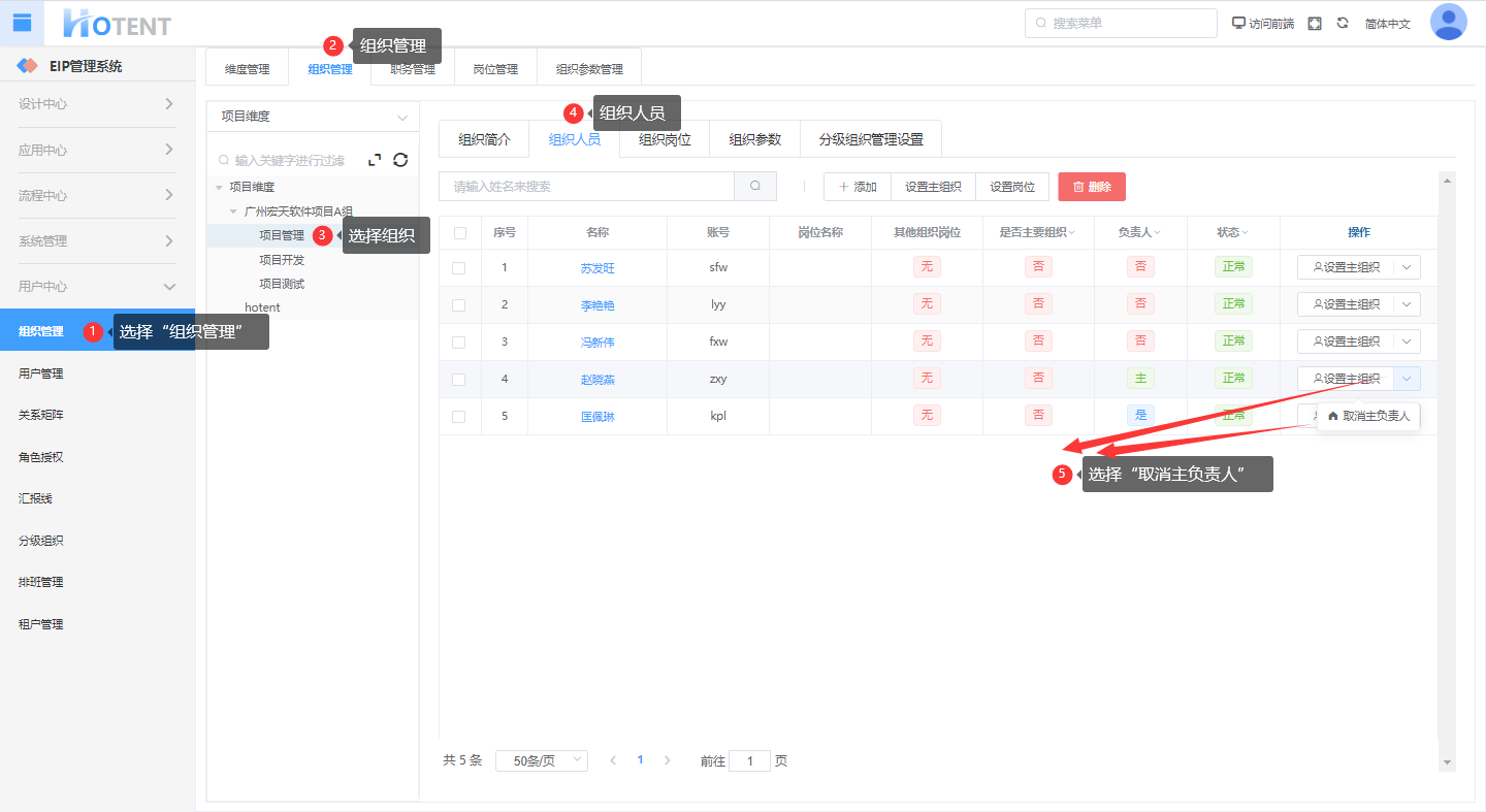 操作:【用户中心】→【组织管理】→【组织管理】→点击组织名称→点击“组织人员”→点击“取消主负责人/取消负责人“