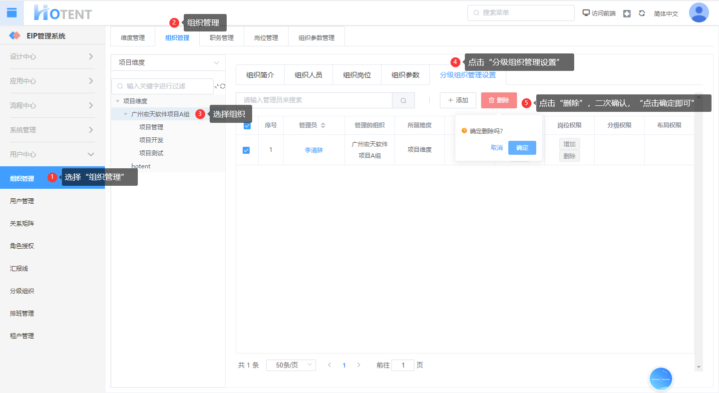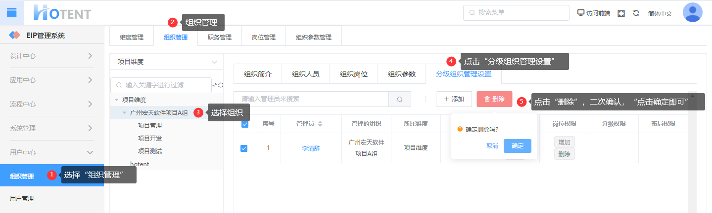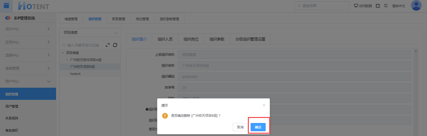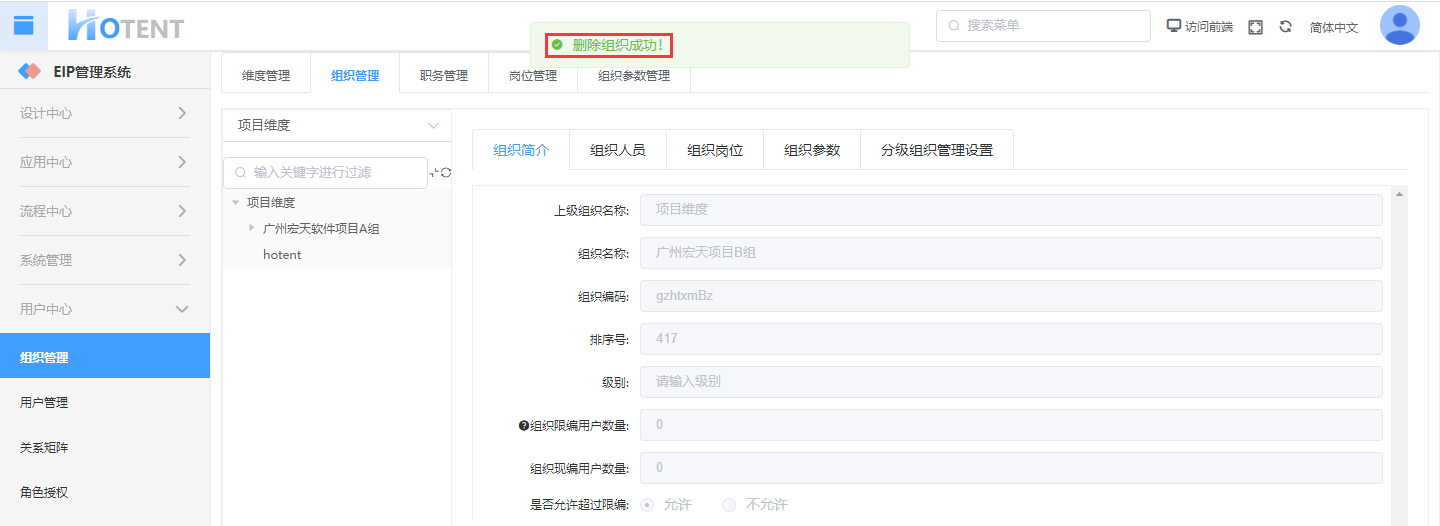 注:删除组织,原通过组织岗位分配带入组织的人员会同步从组织中移除;