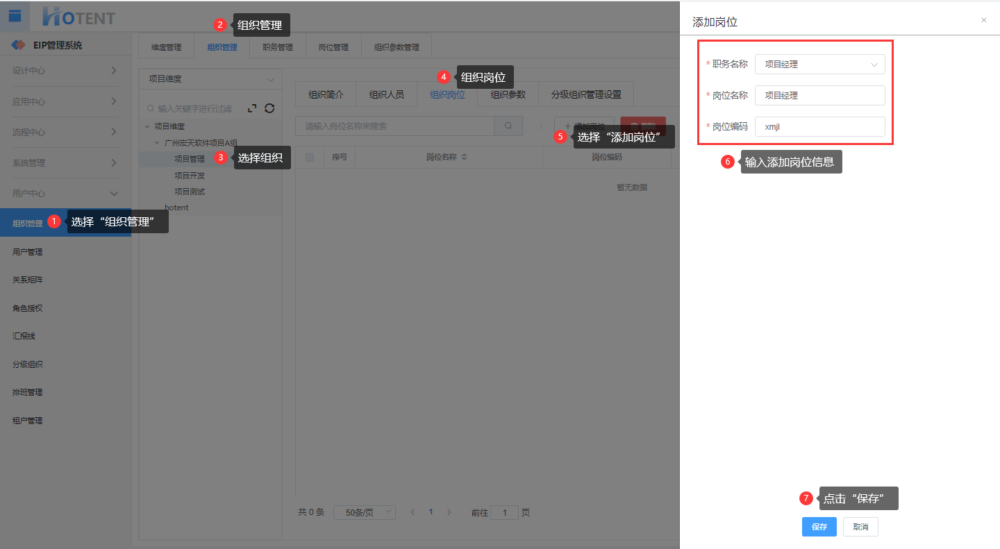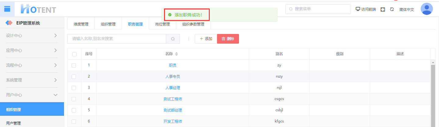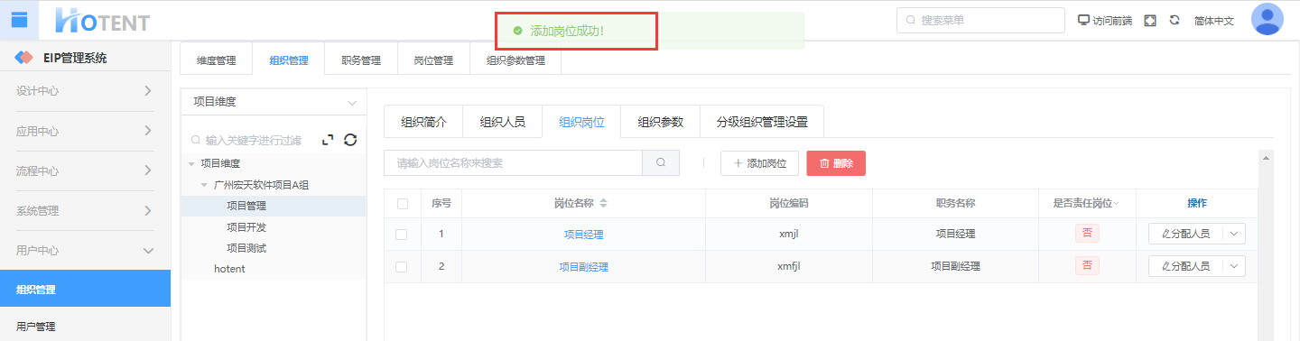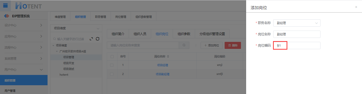 操作:【用户中心】→【组织管理】→【组织管理】→点击组织名称→点击“组织岗位”→点击“添加岗位“→填写岗位信息→点击“保存
