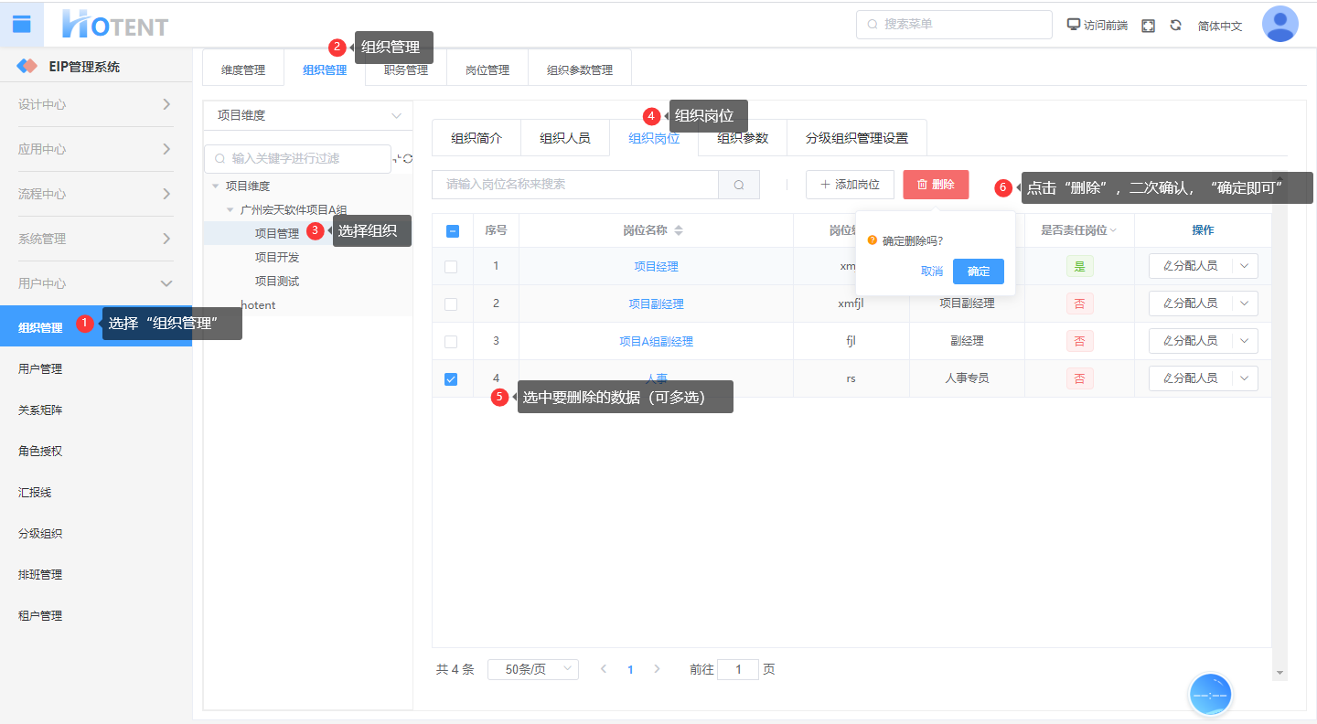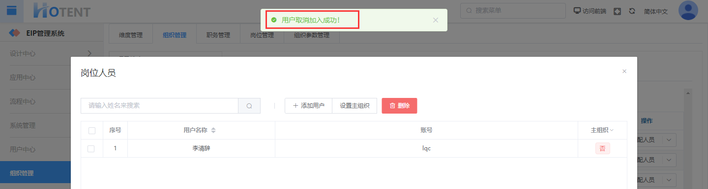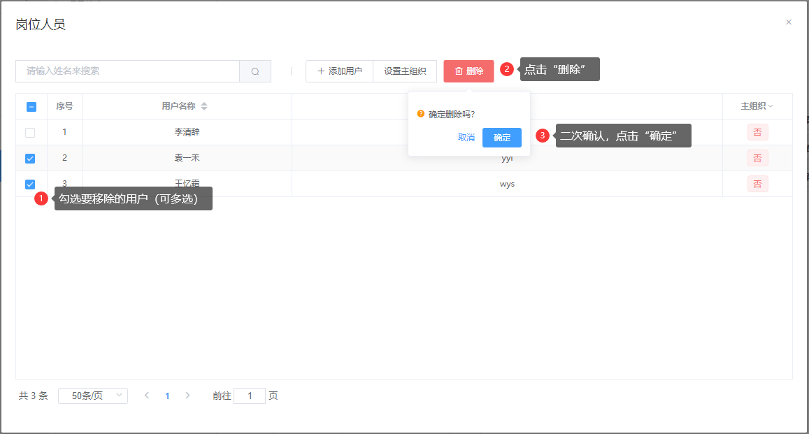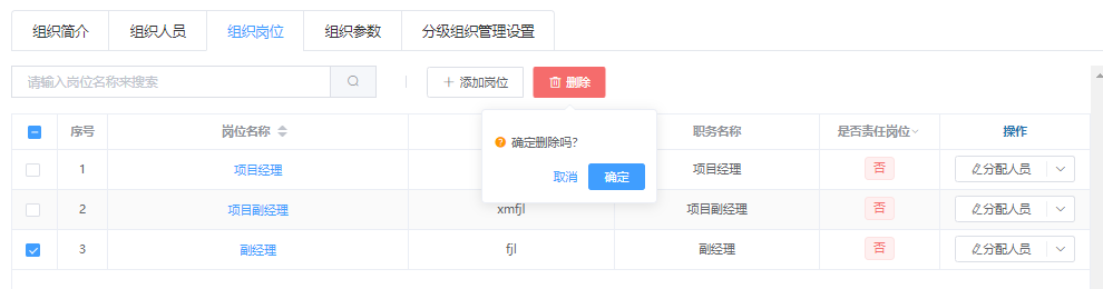 注:通过此操作删除的岗位人员,会同步在【组织管理】→【岗位管理】对应的岗位中移除