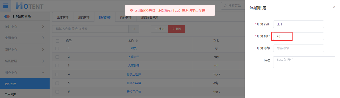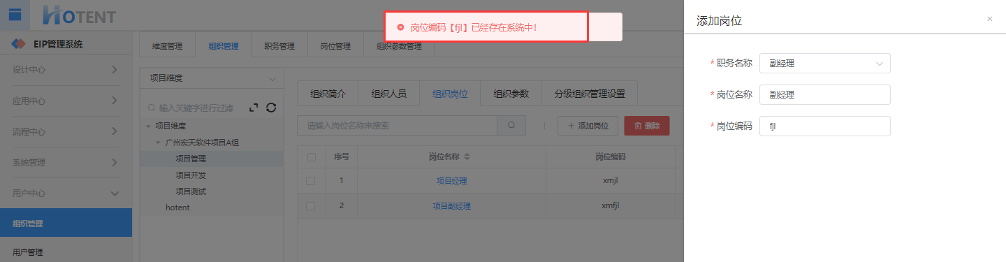 注:编码唯一性,删除岗位为逻辑删除,还存在数据库中,如添加岗位编码与删除岗位编码重复会报错提示,如下图所示,修改岗位编码即可保存成功。