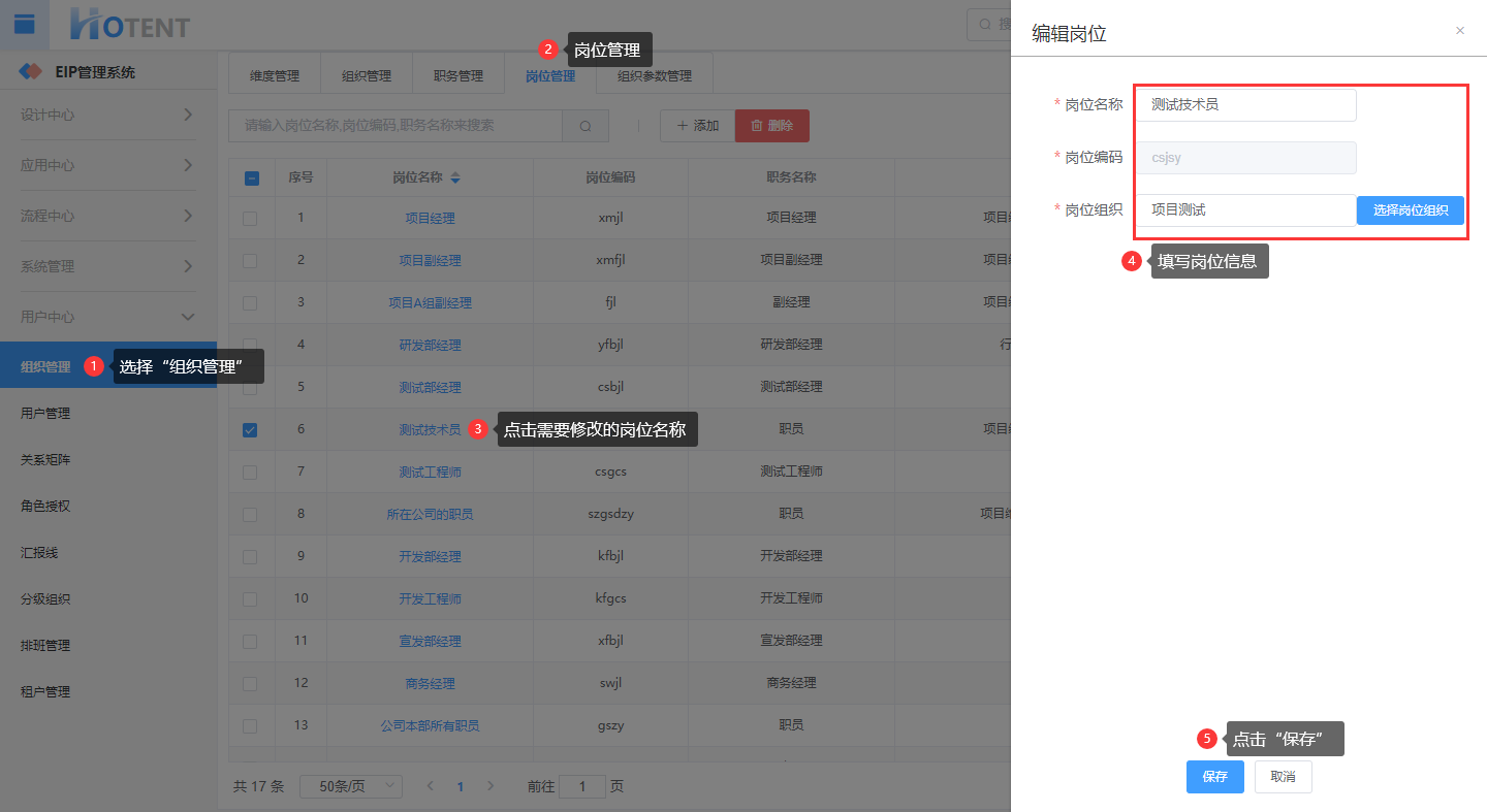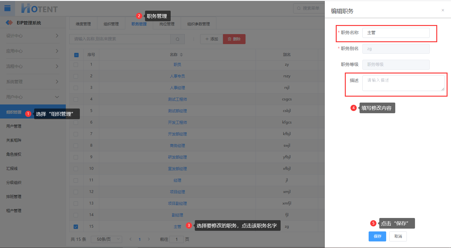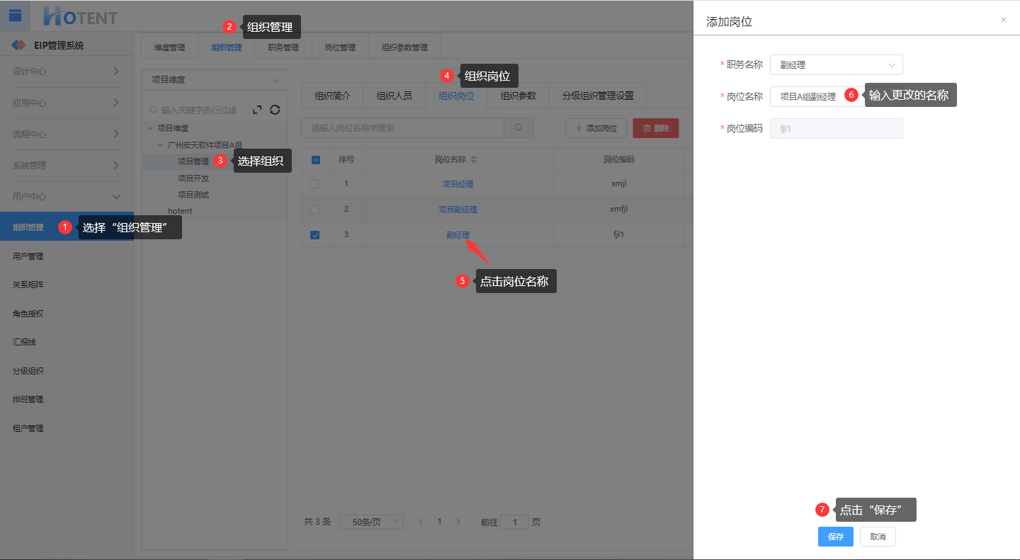 操作:【用户中心】→【组织管理】→【组织管理】→点击组织名称→单击“组织岗位”→点击“岗位名称“→修改“岗位名称”→点击“保存”