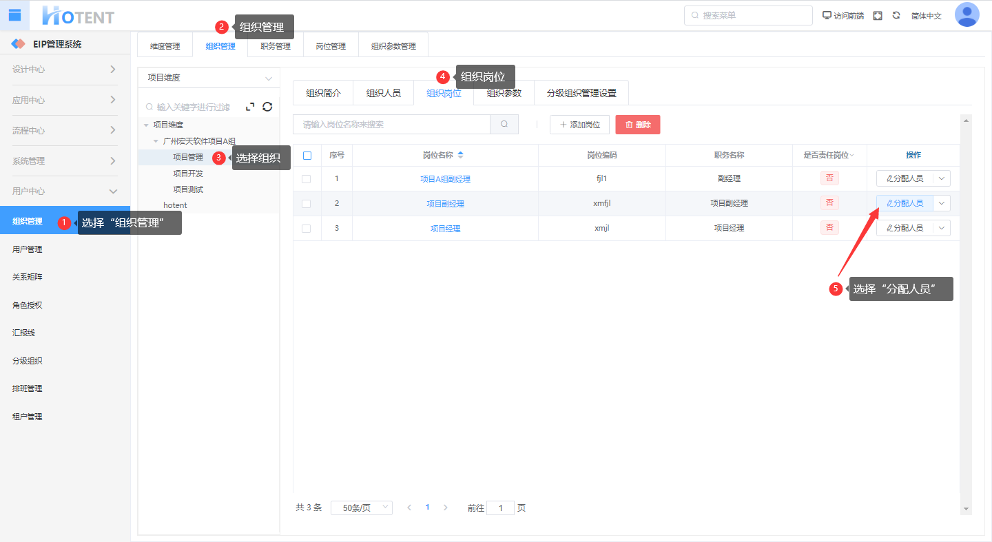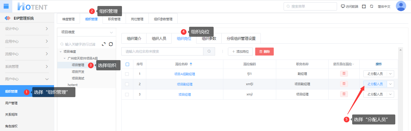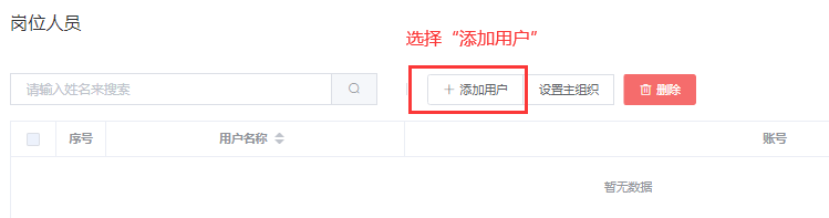 一级操作:【用户中心】→【组织管理】→【组织管理】→点击组织名称→点击“组织岗位”→点击“分配人员”→点击“添加用户”