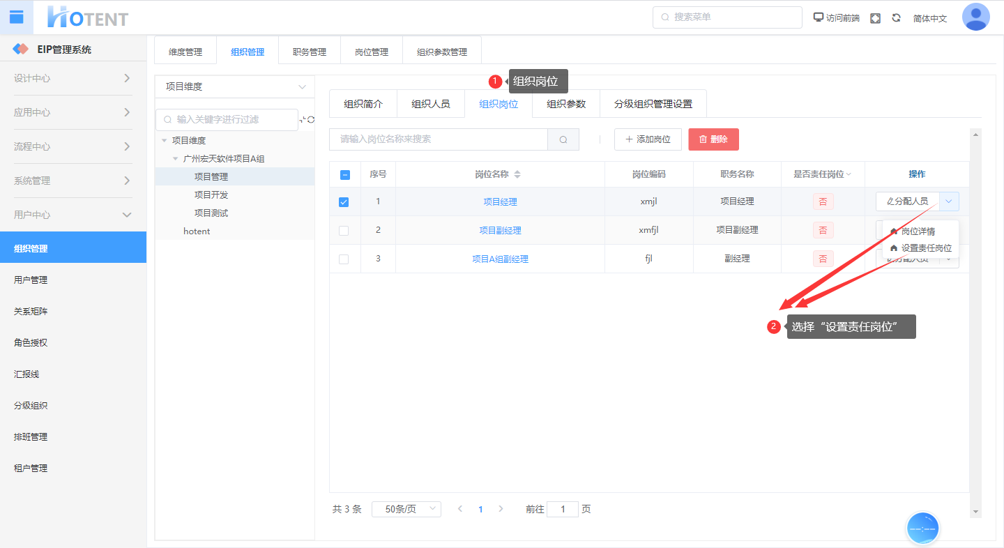 操作:【用户中心】→【组织管理】→【组织管理】→点击组织名称→点击“组织岗位”→鼠标移至或点击“V ”按钮→单击“设置责任岗位”