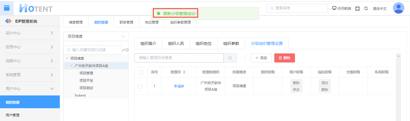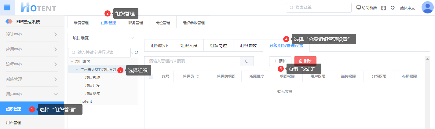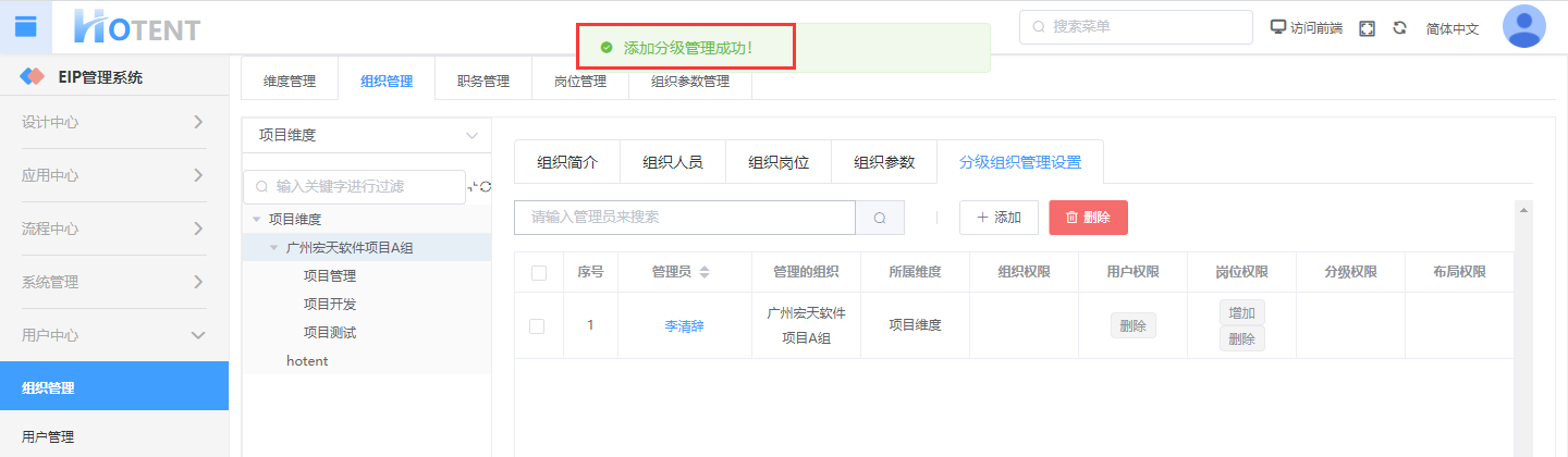 一级操作:【用户中心】→【组织管理】→【组织管理】→点击组织名称→点击“分级组织管理设置”→单击“添加”→点击“保存”