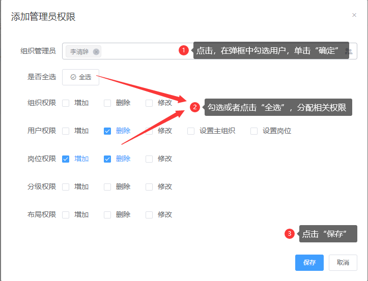 二级操作:单击“选择用户”→选择好用户后,单击“确定”→勾选权限→单击“保存”
