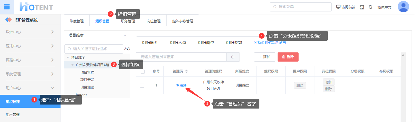 一级操作:【用户中心】→【组织管理】→【组织管理】→点击组织名称→点击“分级组织管理设置”→单击“管理员名称”