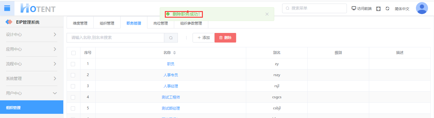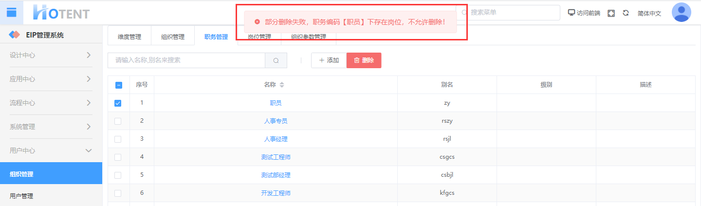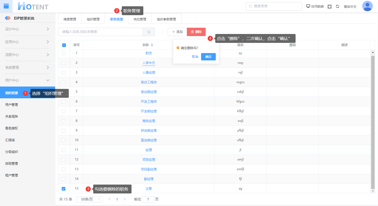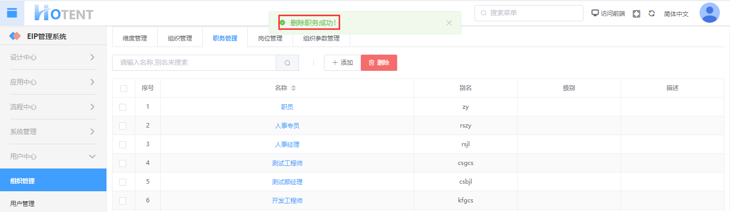 操作:【用户中心】→【组织管理】→【组织管理】→【岗位管理】→勾选需删除的人员→单击“删除”→单击“确定”
