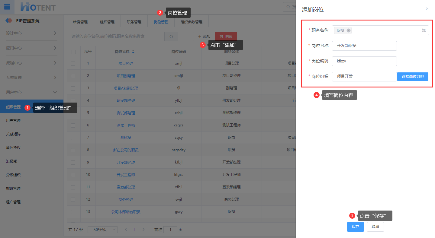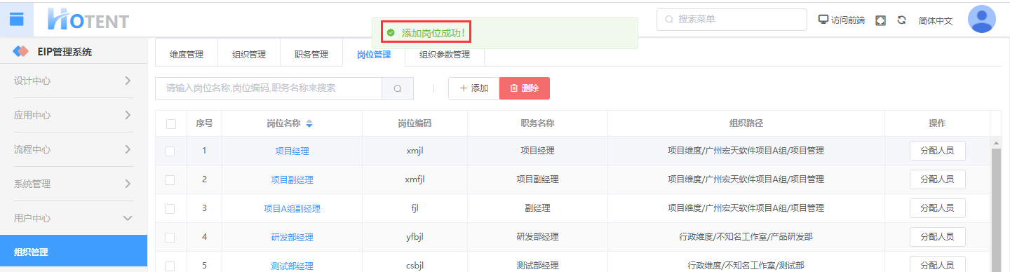 操作:【用户中心】→【组织管理】→【岗位管理】→单击“添加”→修改完毕,单击“保存”