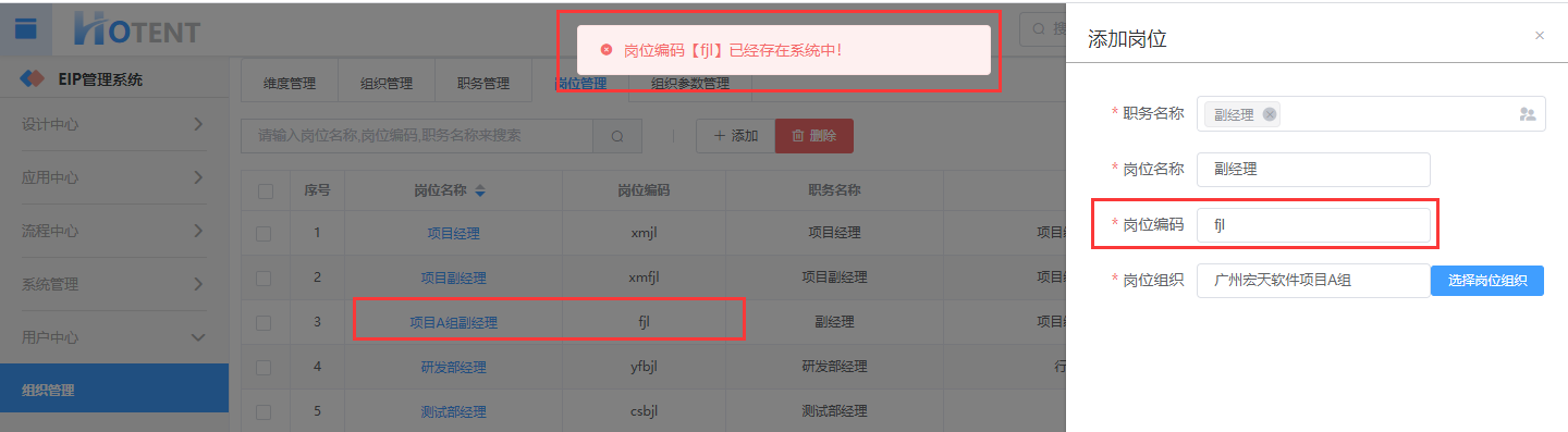 注:岗位编码需唯一,如设置岗位编码重复,保存如下图所示,修改岗位编码唯一即可保存成功。