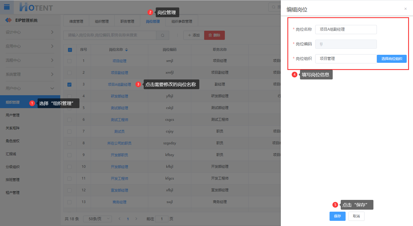 操作:【用户中心】→【组织管理】→【岗位管理】→单击编辑的岗位名称→编辑信息后,单击“保存”