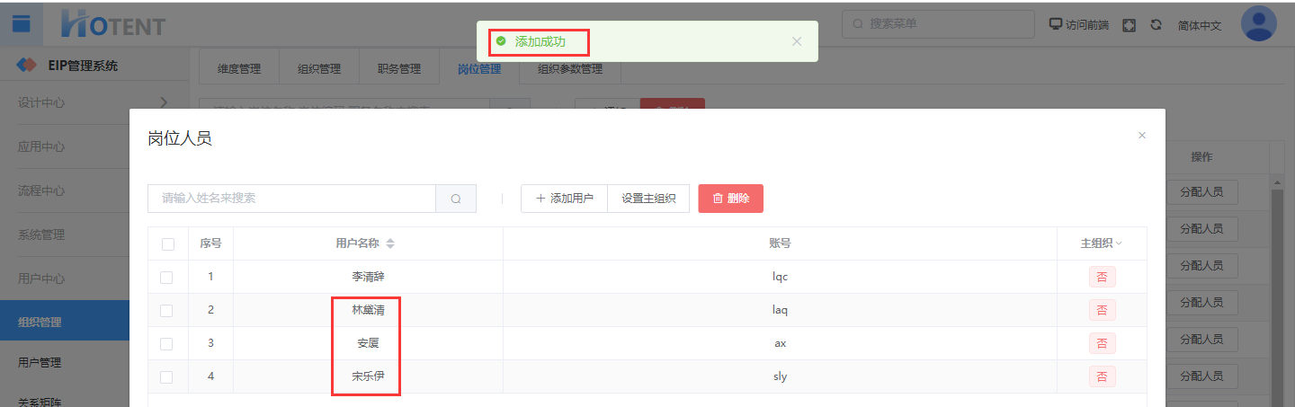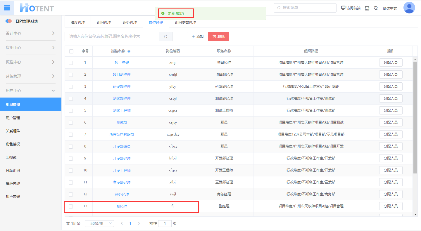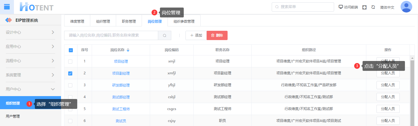 操作:【用户中心】→【组织管理】→【岗位管理】→单击岗位对应操作“分配人员”→编辑信息后,单击“保存”