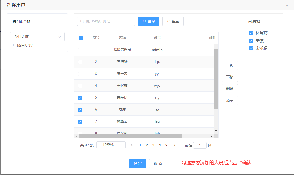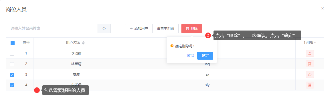 操作:【用户中心】→【组织管理】→【岗位管理】→勾选需删除的人员→单击“删除”→单击“确定”