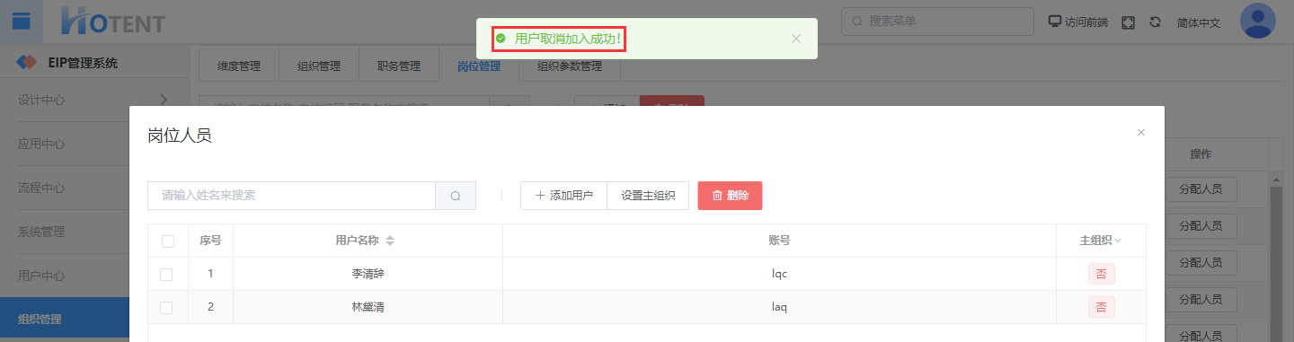 操作:【用户中心】→【组织管理】→【岗位管理】→单击岗位对于的“分配人员”→在『岗位人员』中勾选需删除的人员→单击“删除”