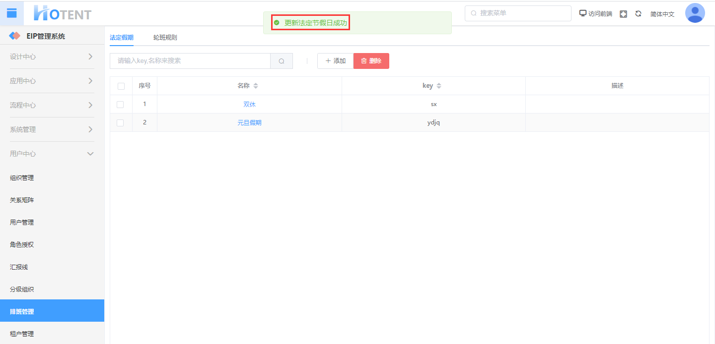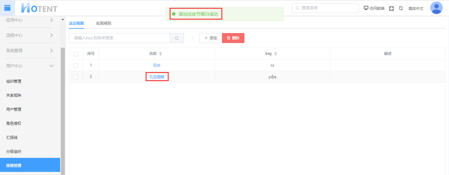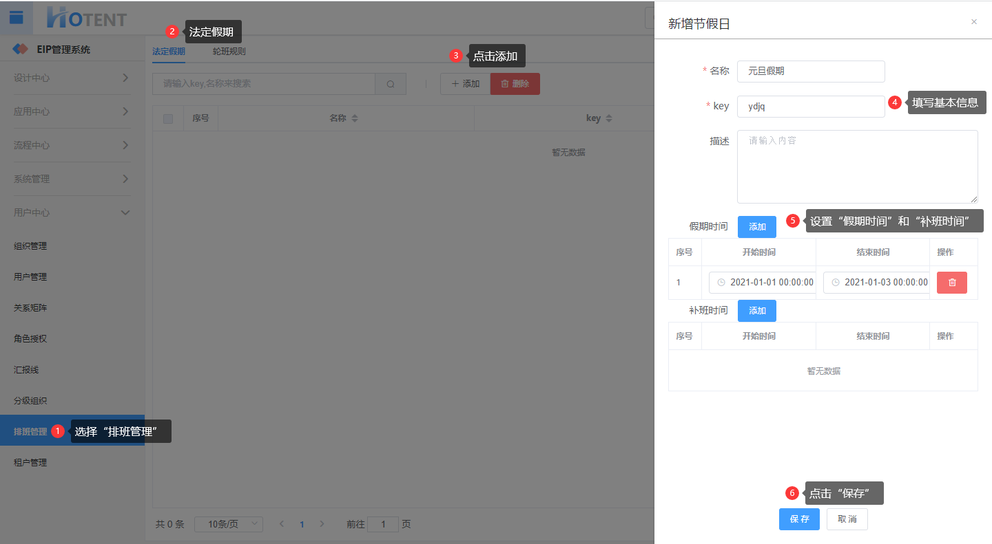 操作:【用户中心】→【排班管理】→【法定假期】→单击“添加”→填写基本信息→设置“假期时间”和“补班时间”→单击“保存”