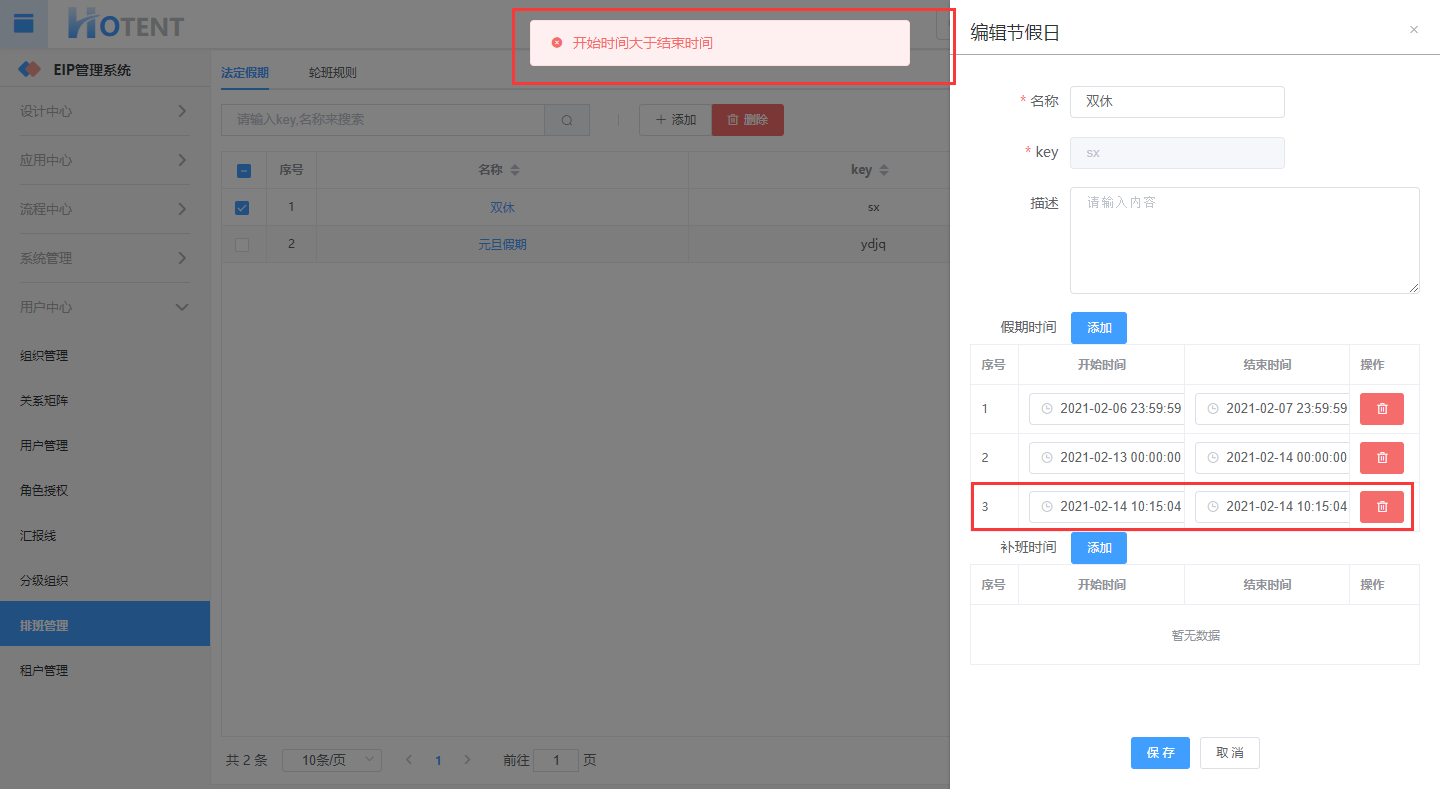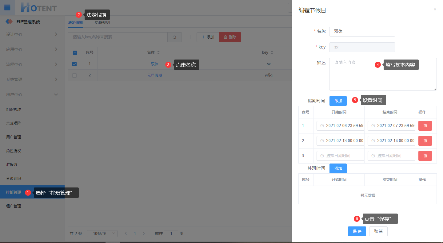操作:【用户中心】→【排班管理】→【法定假期】→单击需要编辑的假期名称→填写基本信息→设置“假期时间”和“补班时间”→单击“保存”