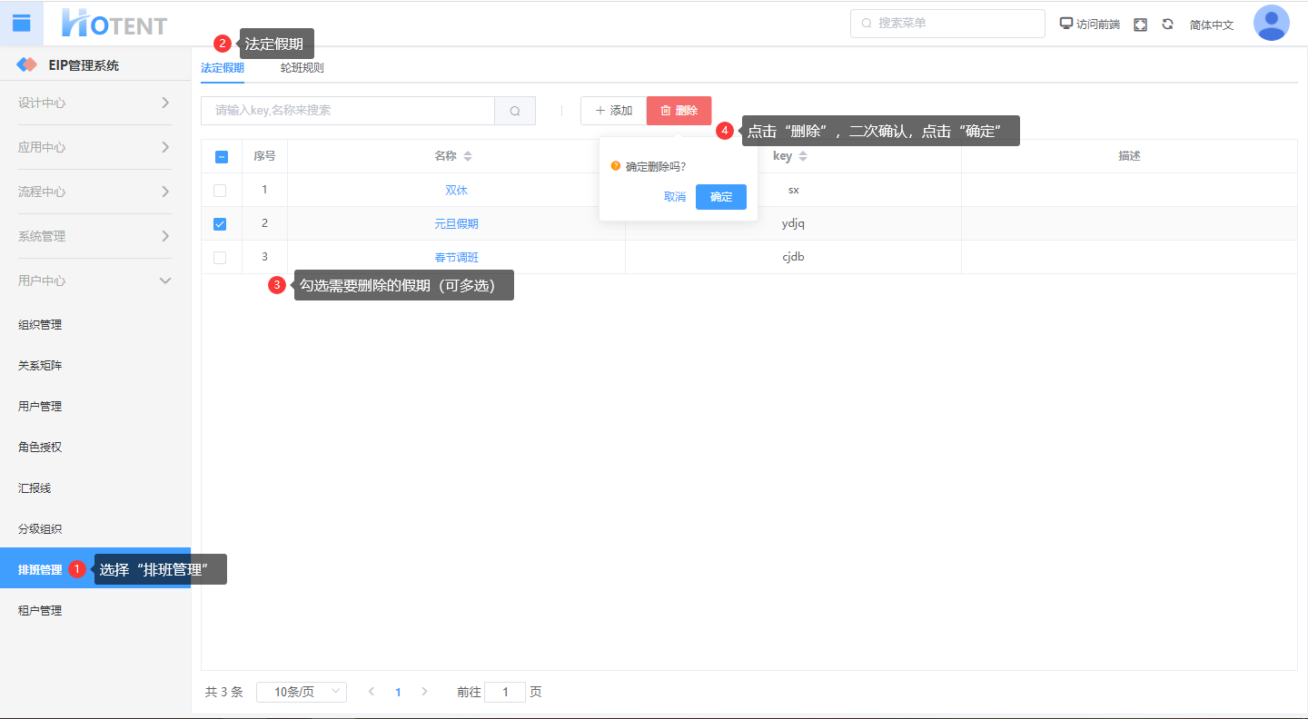 操作:【用户中心】→【排班管理】→【法定假期】→勾选需要删除的假期→点击“删除”,二次确认,点击“确定”