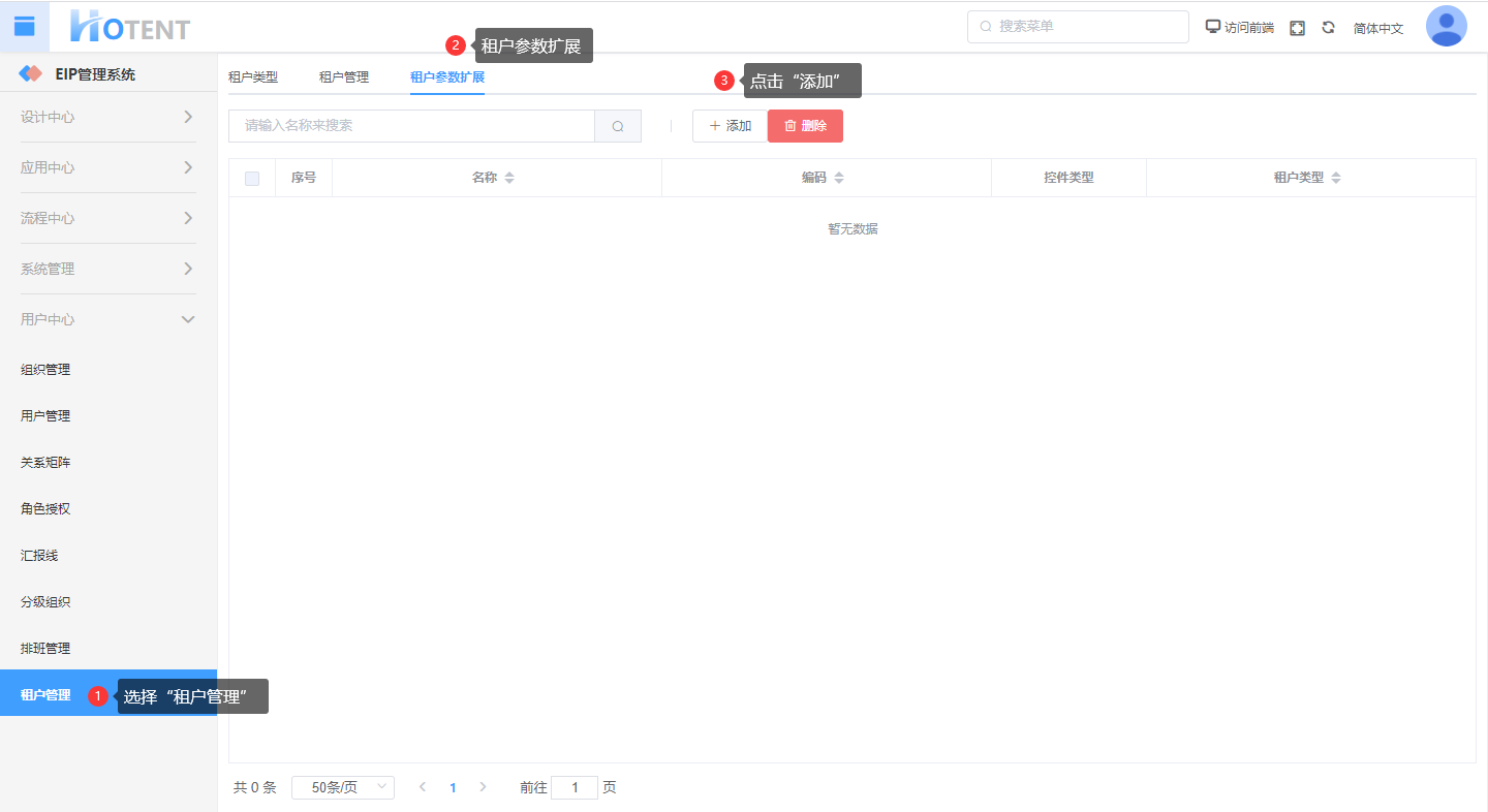 操作:【用户中心】→单击【租户管理】→『租户参数扩展』→点击“添加”→填写相关参数→点击“保存”