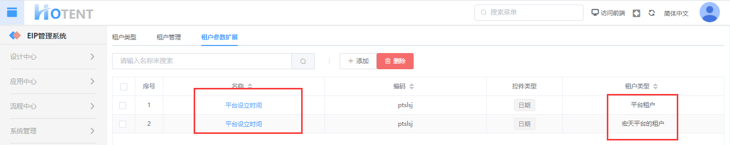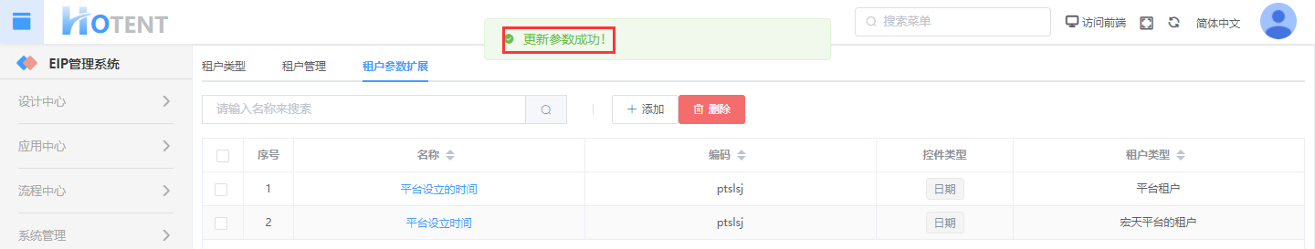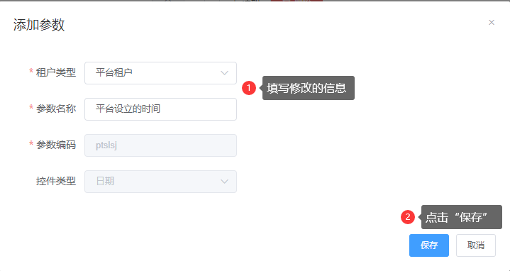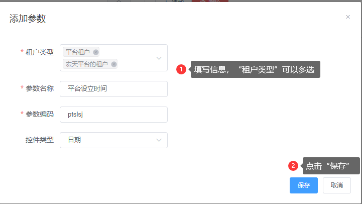 注:参数编码是租户类型、参数名称、参数编码、控件类型都是必填字段