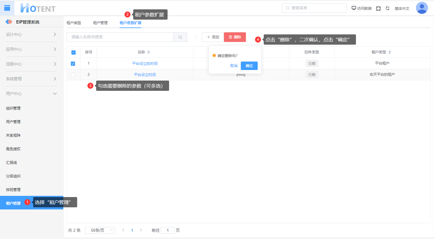 操作:【用户中心】→单击【租户管理】→『租户参数扩展』→勾选参数,点击“删除”→填写相关参数→点击“保存”